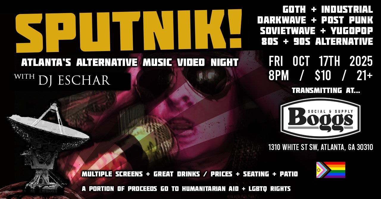 Boggs Social & Supply 1310 White St SW, Atlanta, Georgia, United StatesFriday, October 17th at Boggs Social & Supply: Join us for Sputnik - Atlanta's ONLY Dedicated Alternative Music Video Night! It's time to once again dance under the light of the neon screens! 10/17 | 8PM | $10 | 21+ TICKETS + Great Drinks + Great Prices + On-Site Parking + Outdoor Patio + Plenty of